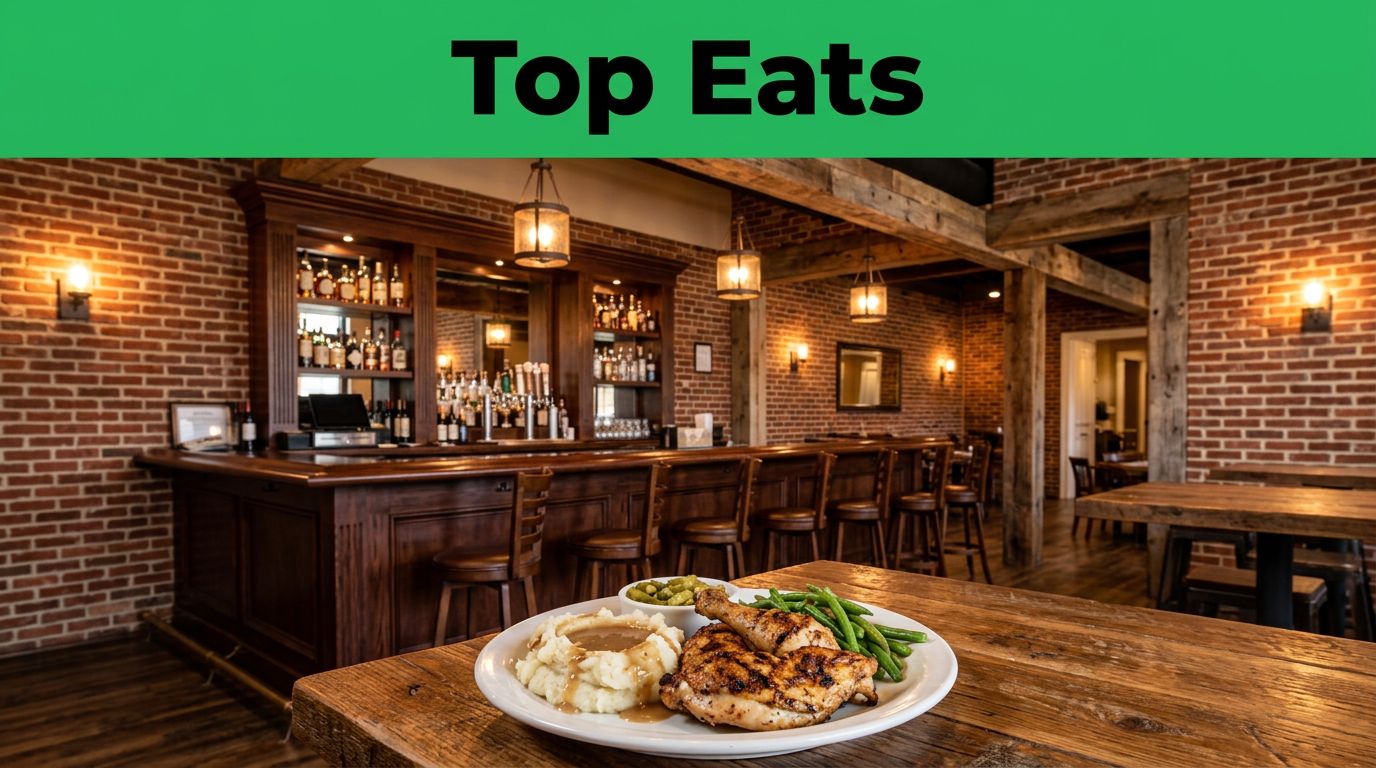 The space matters here. Brick walls, exposed wood beams, a full bar, and live music give it more energy than a plain dinner spot. Local coverage also points to dishes like Low Country Chicken, which tells you the kitchen is aiming beyond basic chain fare.