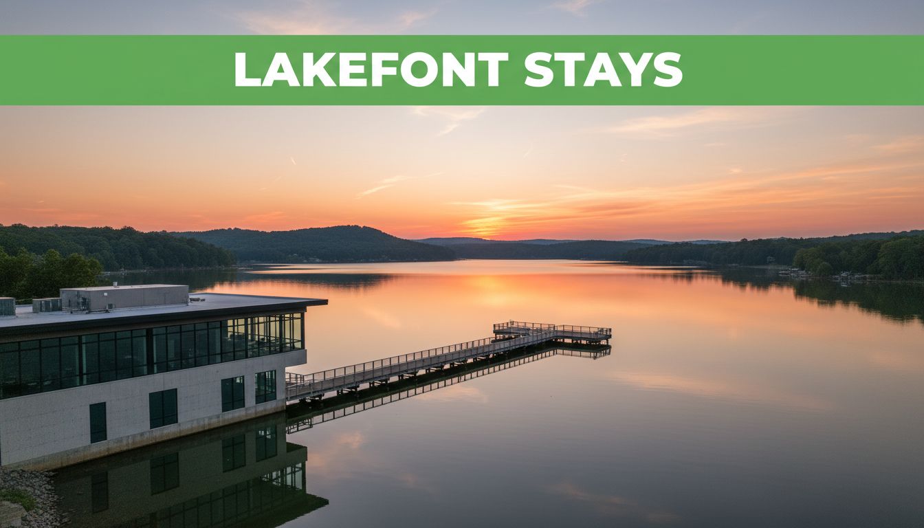 Modern hotel exterior on Lake Guntersville shoreline during golden hour sunset, with calm reflective water, balcony rooms, parked cars, lush trees, and a bold 'Lakefront Hotels' headline in green band at top.