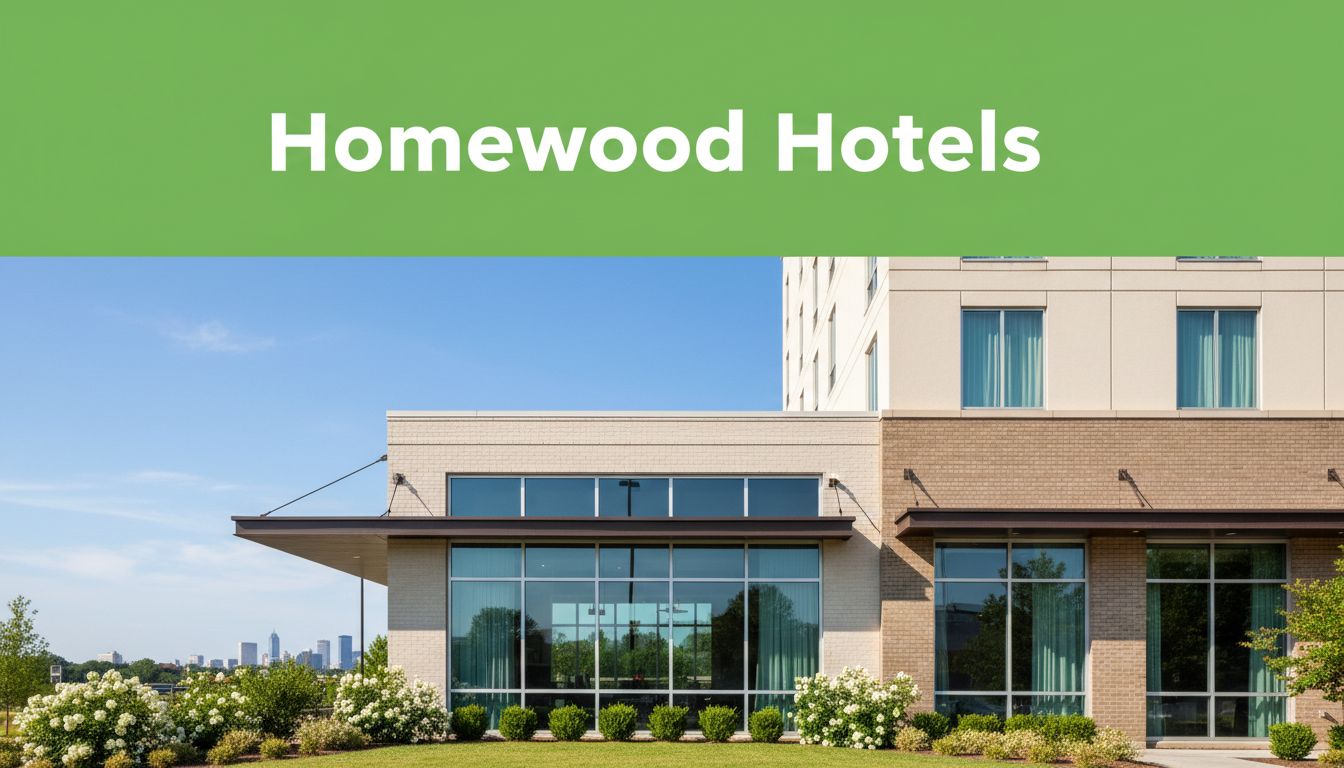 Realistic daytime photo of Homewood, Alabama's suburban neighborhood with modern hotels in the background, green lawns, oak trees, and highway signs to Birmingham, featuring a centered focal hotel building under a top green header band with bold 'HOMEWOOD STAYS' text.